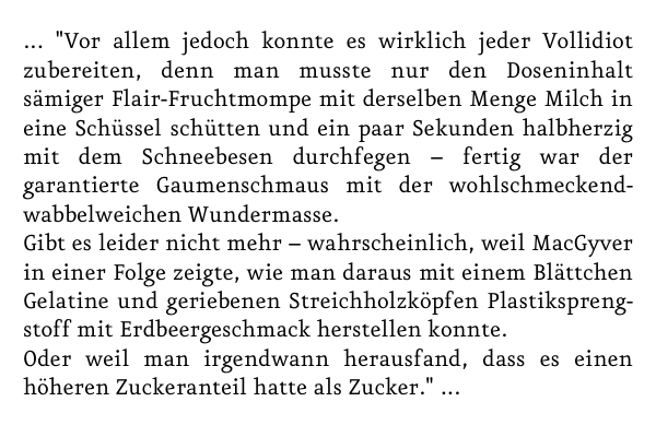 Da in dieser satirischen Parodie mit Herz leider nicht alle Lebensbereiche Platz finden konnten, hoffen wir sehr auf weitere Bände – als Fortsetzung dieser gemeinsamen Zeitreise zurück in die eigene Jugend. Wir wären sofort wieder dabei.